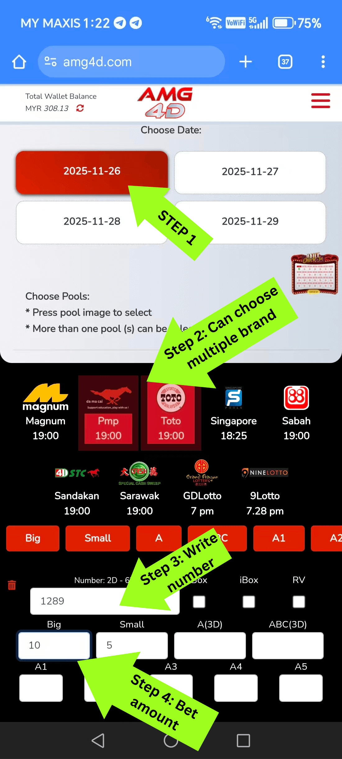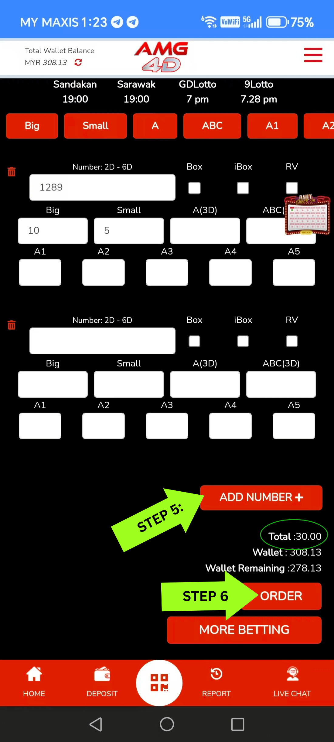 - 4D எண், பந்தயத் தொகை மற்றும் வரிசைமாற்றம் ஆகியவற்றை நிரப்பவும் (உங்களுக்குத் தேவையில்லை என்றால் பெட்டி / IBOX பெட்டியை விட்டு விடுங்கள்).
